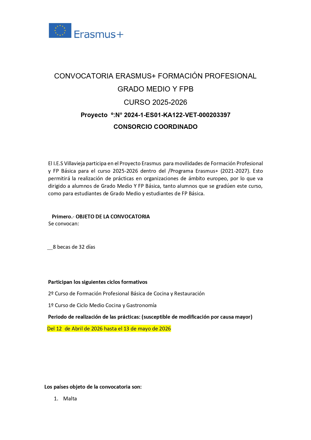 Con la llegada de estas fechas ,no podemos estar mas felices y satisfechos de comunicar que nuestro centro y mas concretamente , el Ciclo de Formación Profesional Básica “Cocina y Restauración así como el Ciclo Medio de Cocina y Gastronomía“ perteneciente al Departamento de Hostelería y Turismo ,han sido subvencionado con una Beca Erasmus + por el Servicio Español para la Internacionalización de la Educación (SEPIE) para que nuestros alumnos y alumnas puedan hacer las prácticas de empresa en Malta.